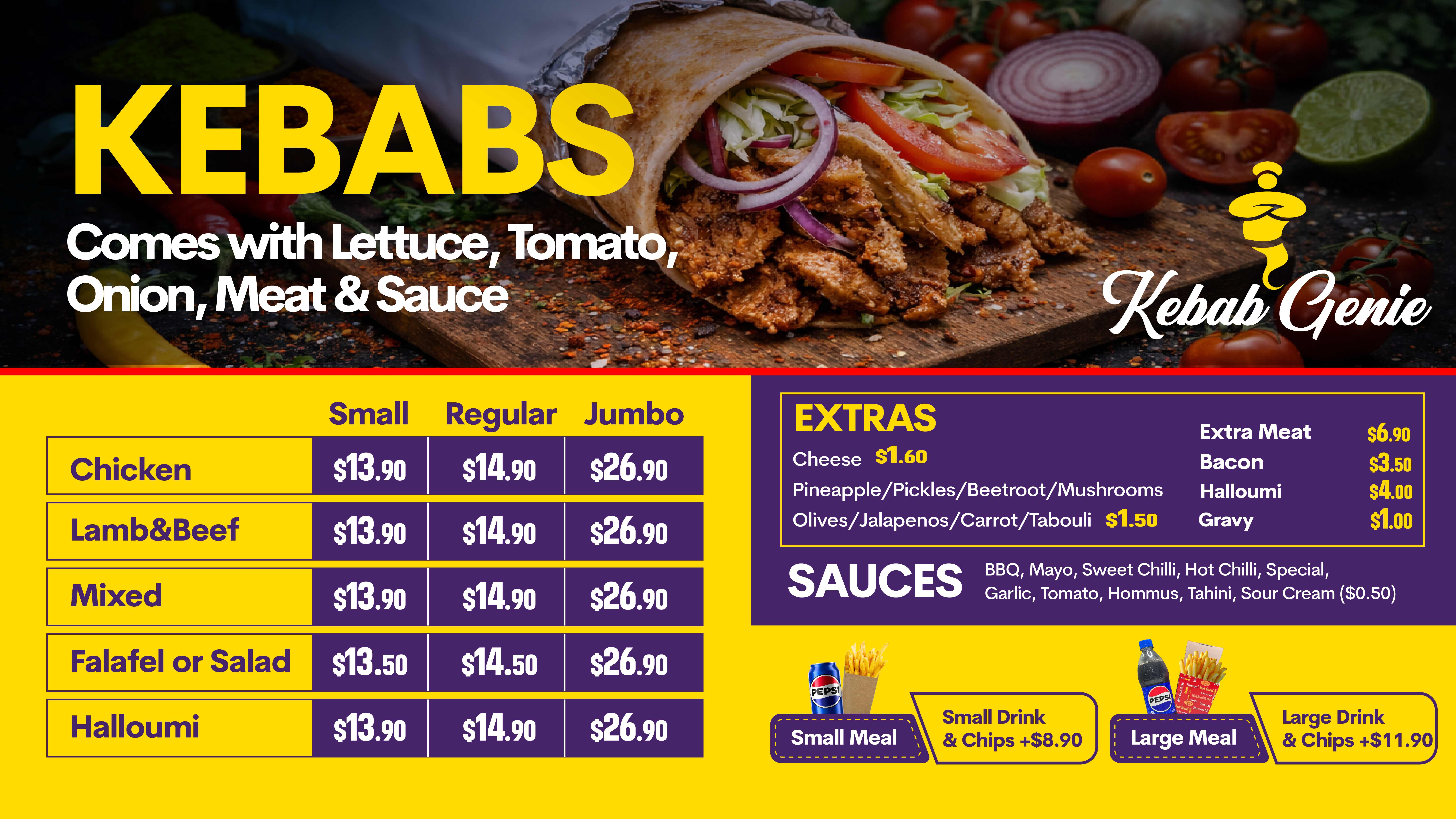 At Kebab Genie, we believe in granting your food wishes with every order. Our passion for authentic Mediterranean cuisine drives us to create dishes that are not just meals, but memorable experiences. From our signature kebabs to our loaded snack packs, every item is crafted with love and the finest ingredients.